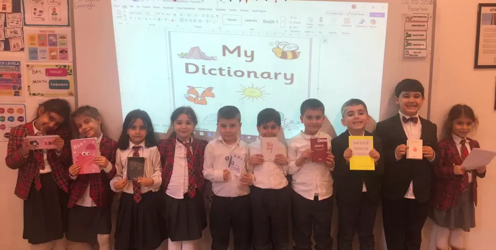Ara tatil sürecinde 1. sınıf öğrencilerinden İngilizce öğrenme yolculuklarının ilk adımı olarak kendi İngilizce sözlüklerini hazırlamaları istendi. Bu çalışma; yalnızca kelime ezberlemeyi değil, öğrenmeyi anlamlandırmayı ve keyifli hâle